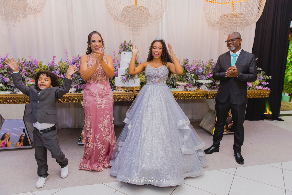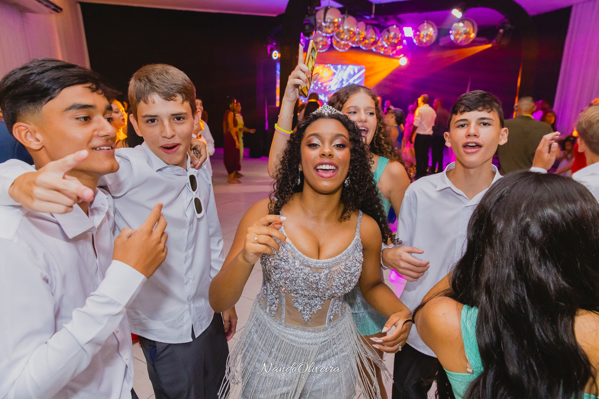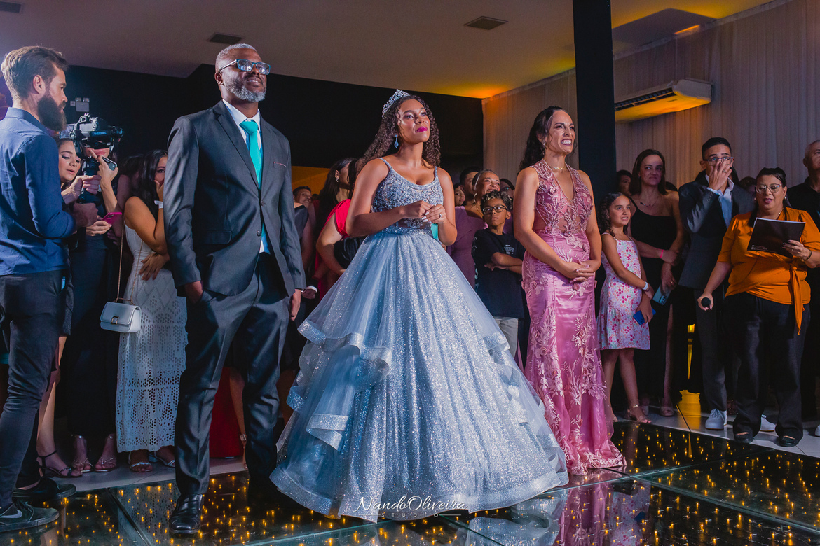Uma noite simplesmente linda, daquelas que ficam na memória. O salão estava cheio, rodeado de amigos e familiares que fizeram questão de celebrar cada momento ao lado dela.