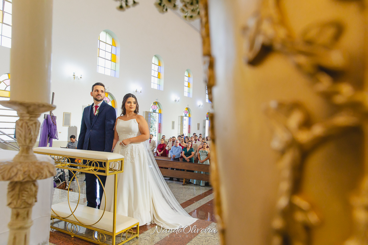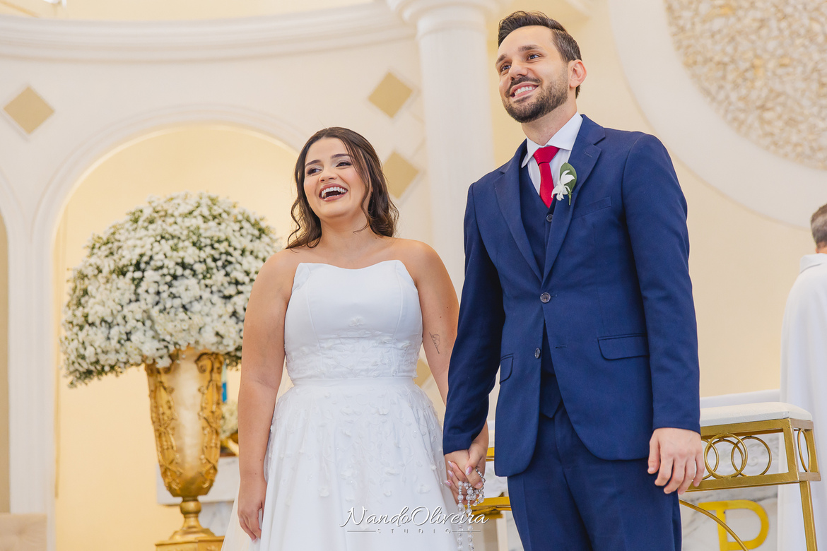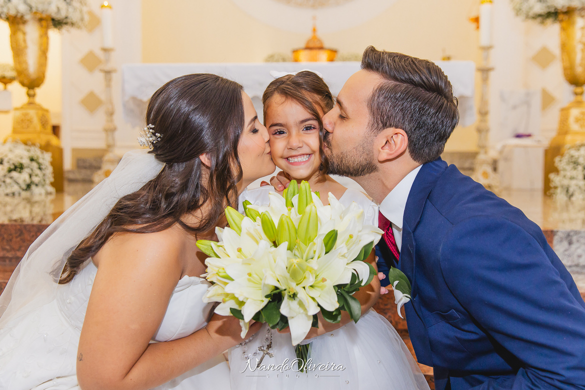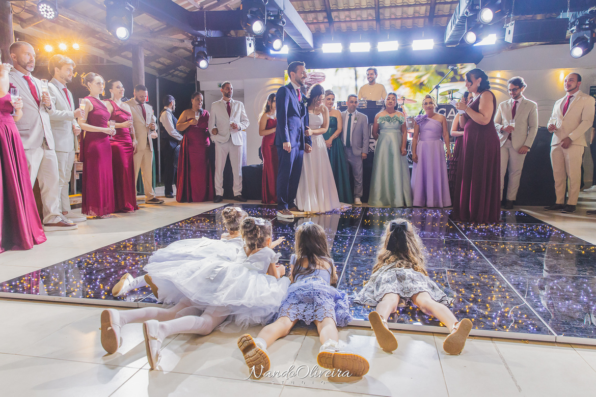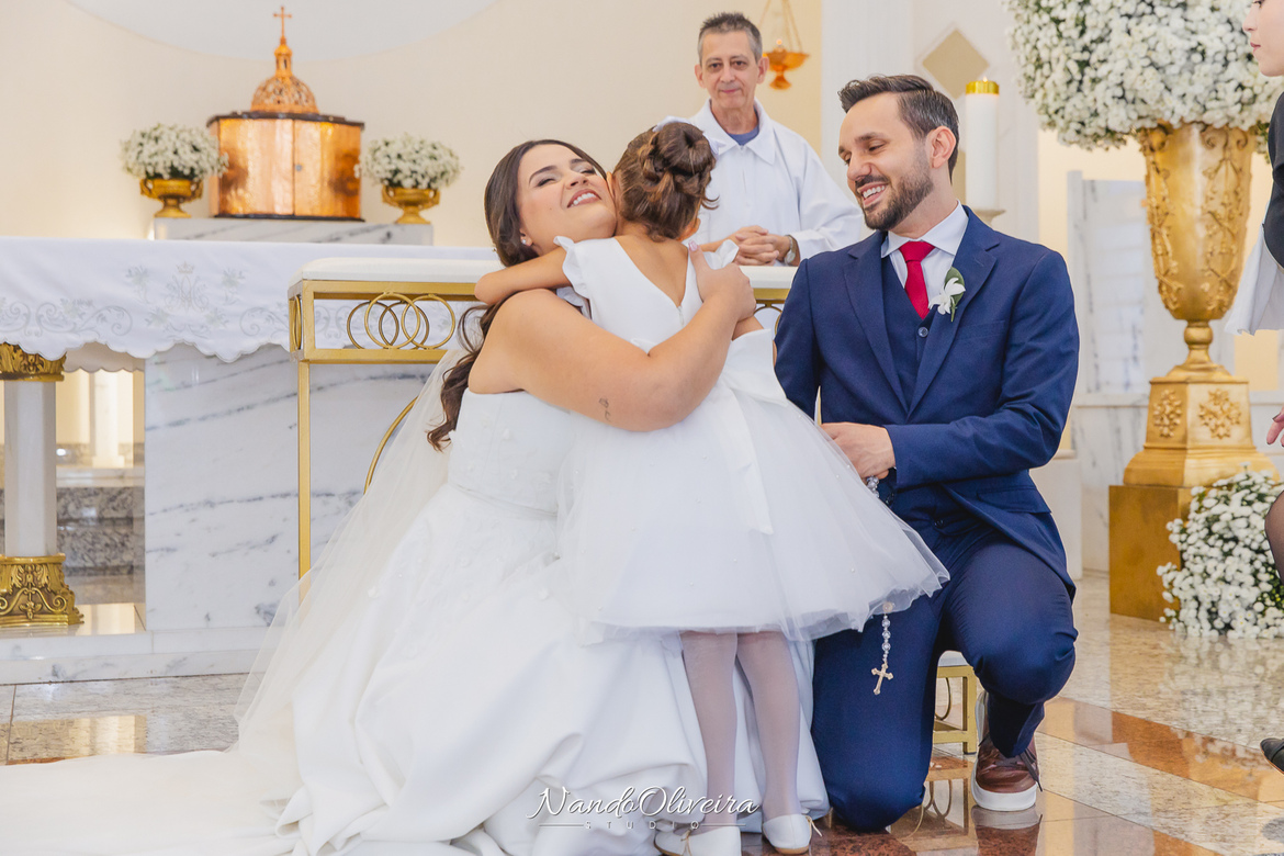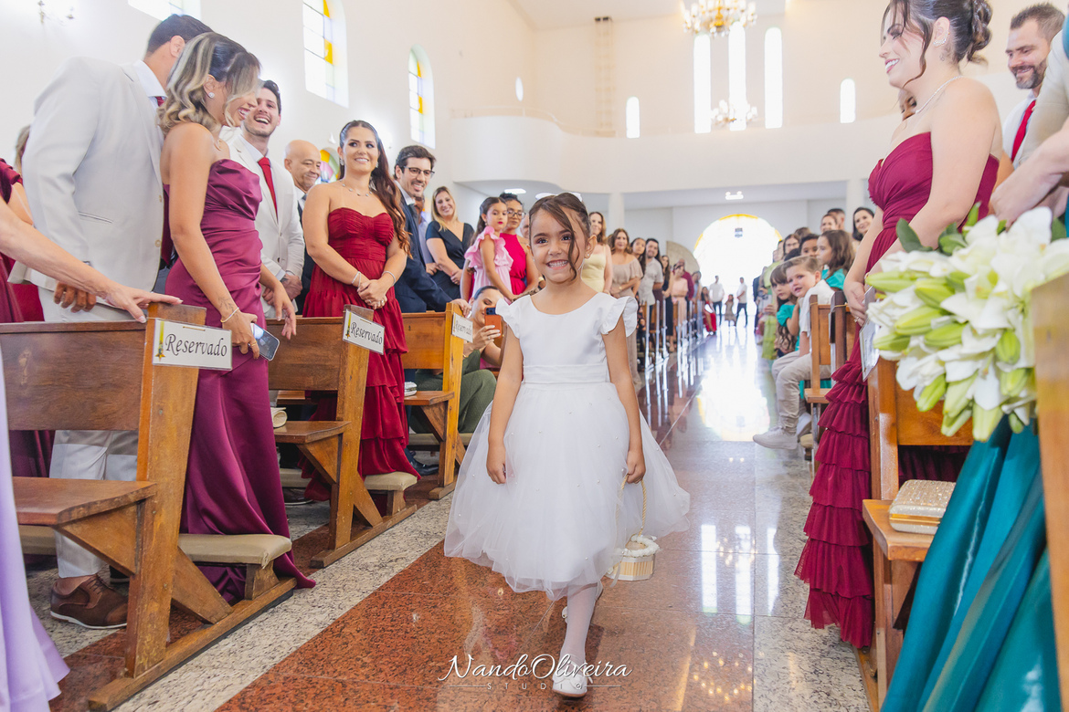 O casal estava radiante, não conseguia conter os sorrisos. A conexão entre eles era evidente em cada olhar, em cada gesto. Uma cerimônia linda. E um dos momentos mais especiais: a pequena Sophia, filha do Mateus, foi quem levou as alianças. Delicadeza, doçura e muito simbolismo nesse instante tão único.