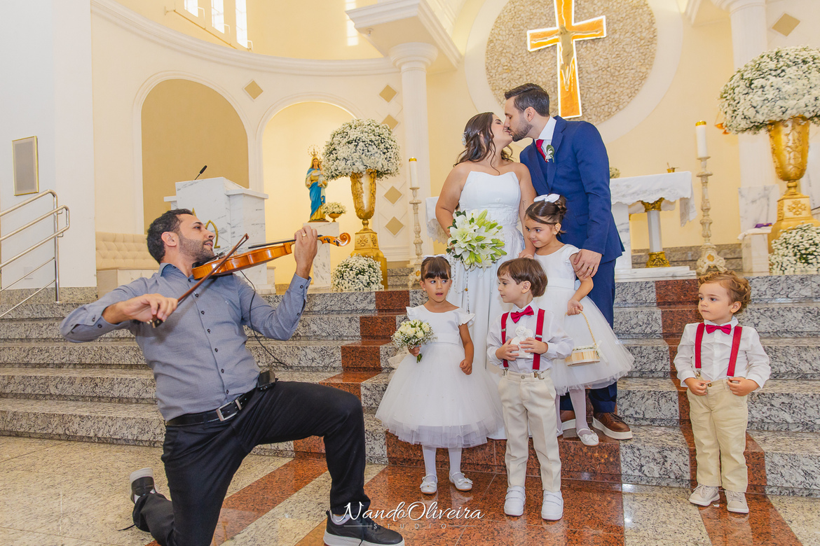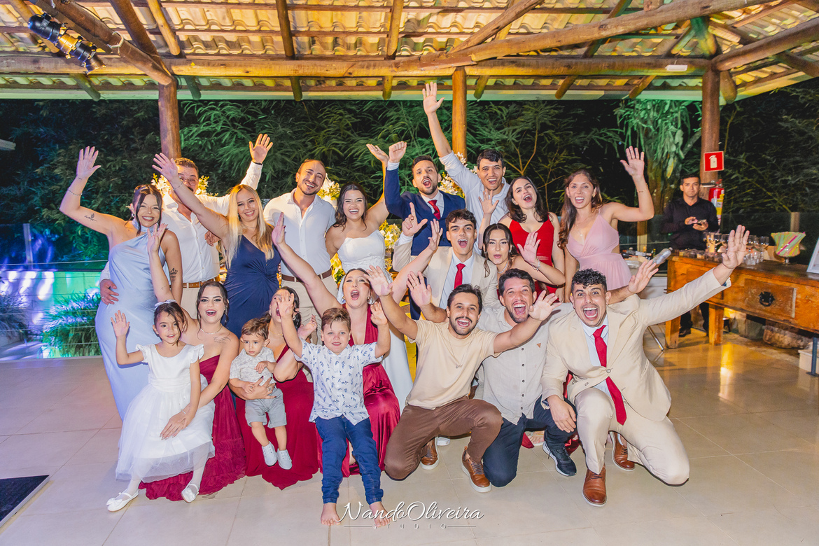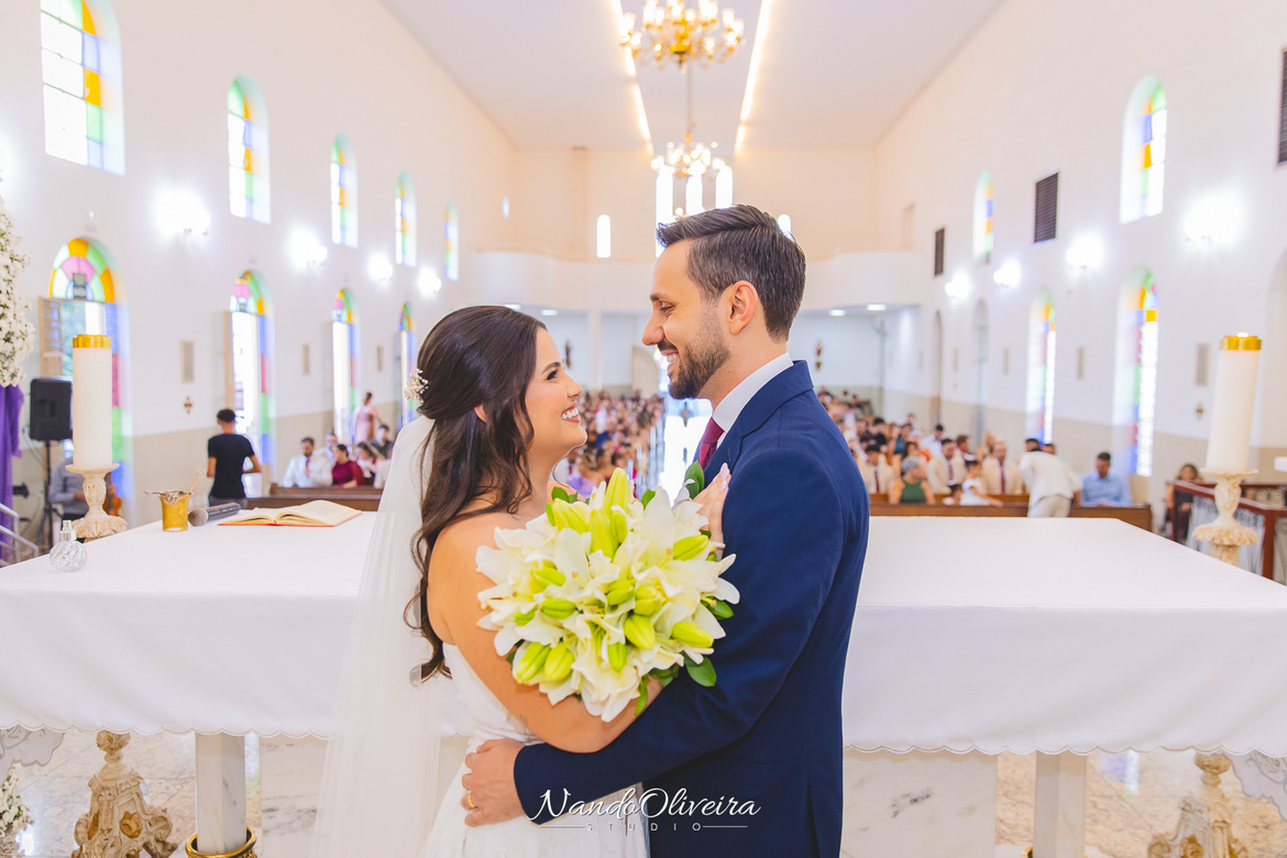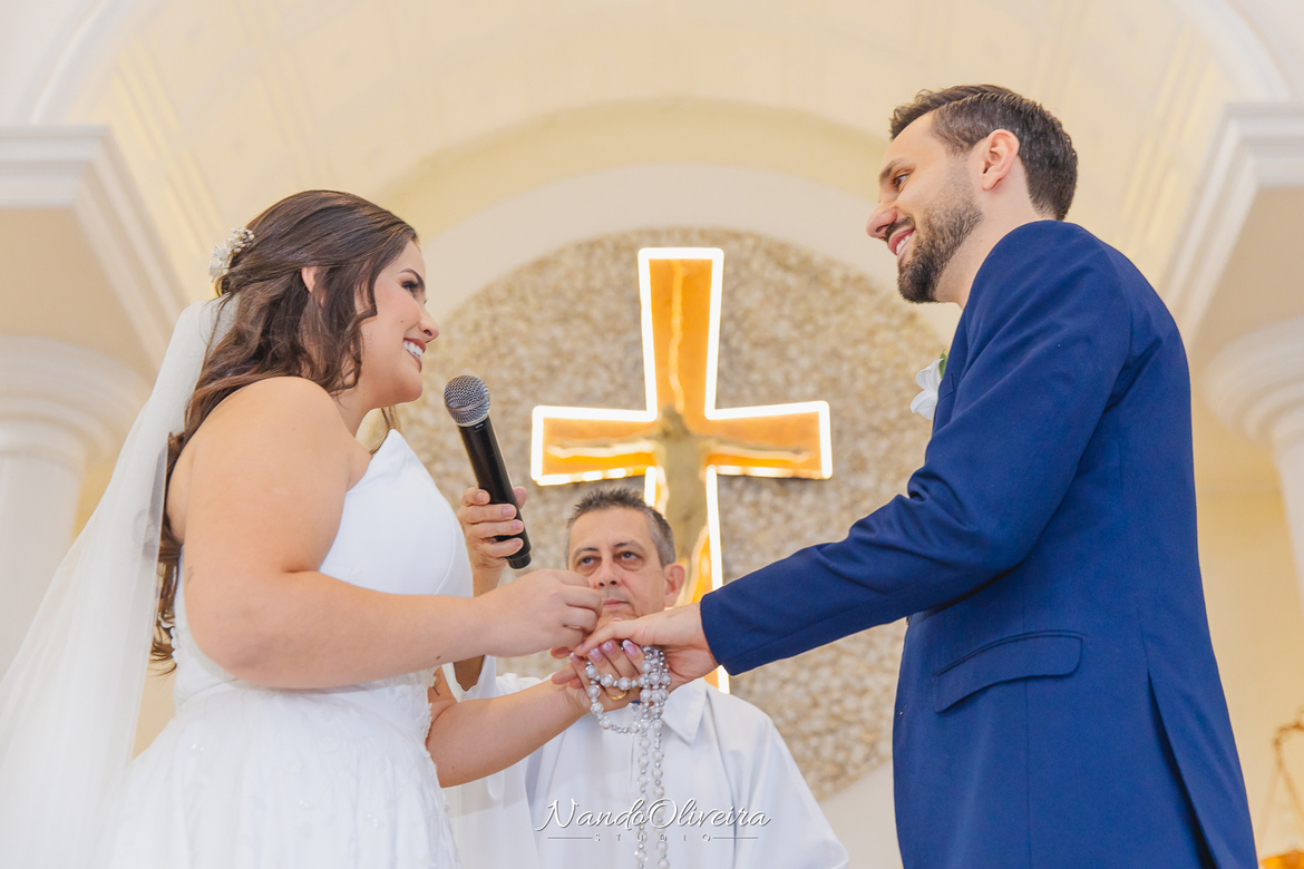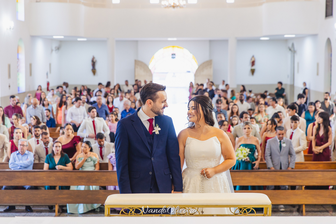O casal estava radiante, não conseguia conter os sorrisos. A conexão entre eles era evidente em cada olhar, em cada gesto. Uma cerimônia linda. E um dos momentos mais especiais: a pequena Sophia, filha do Mateus, foi quem levou as alianças. Delicadeza, doçura e muito simbolismo nesse instante tão único.