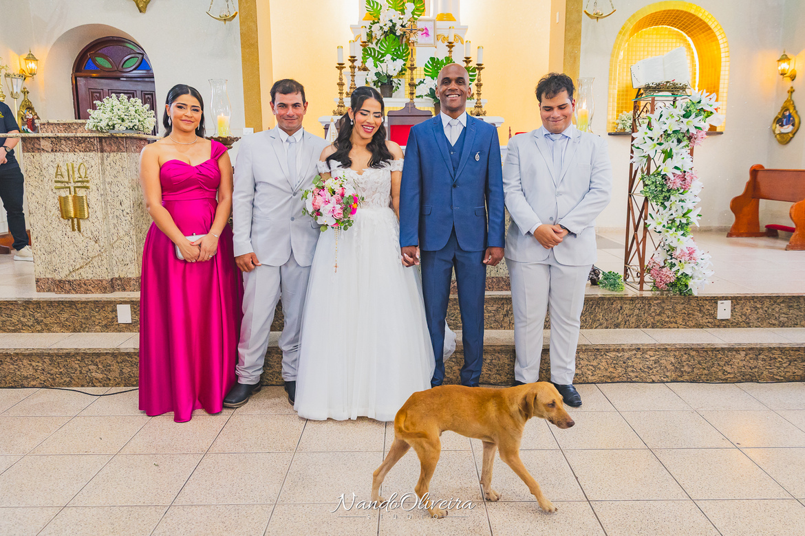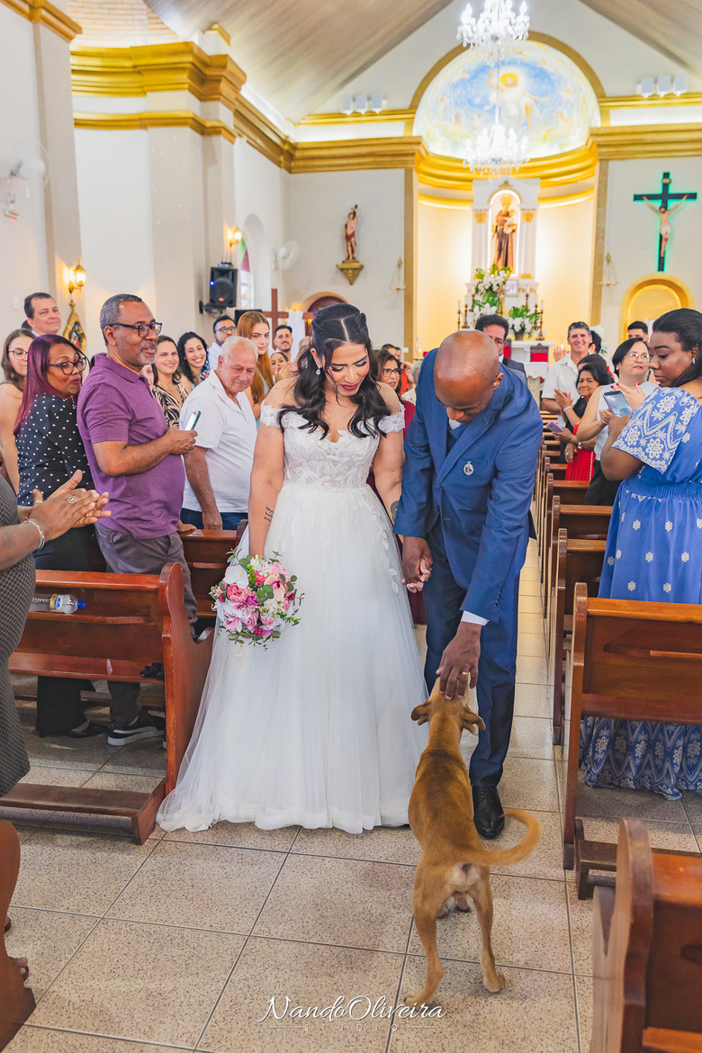 O grande dia da Rayssa e Pedro foi simplesmente inesquecível! Igreja cheia, uma cerimônia linda e emocionante, a alegria contagiante dos noivos e até participação especial do cachorro caramelo que passou despretensiosamente pelos corredores da igreja e é claro, não pude deixar de registar. kkkk